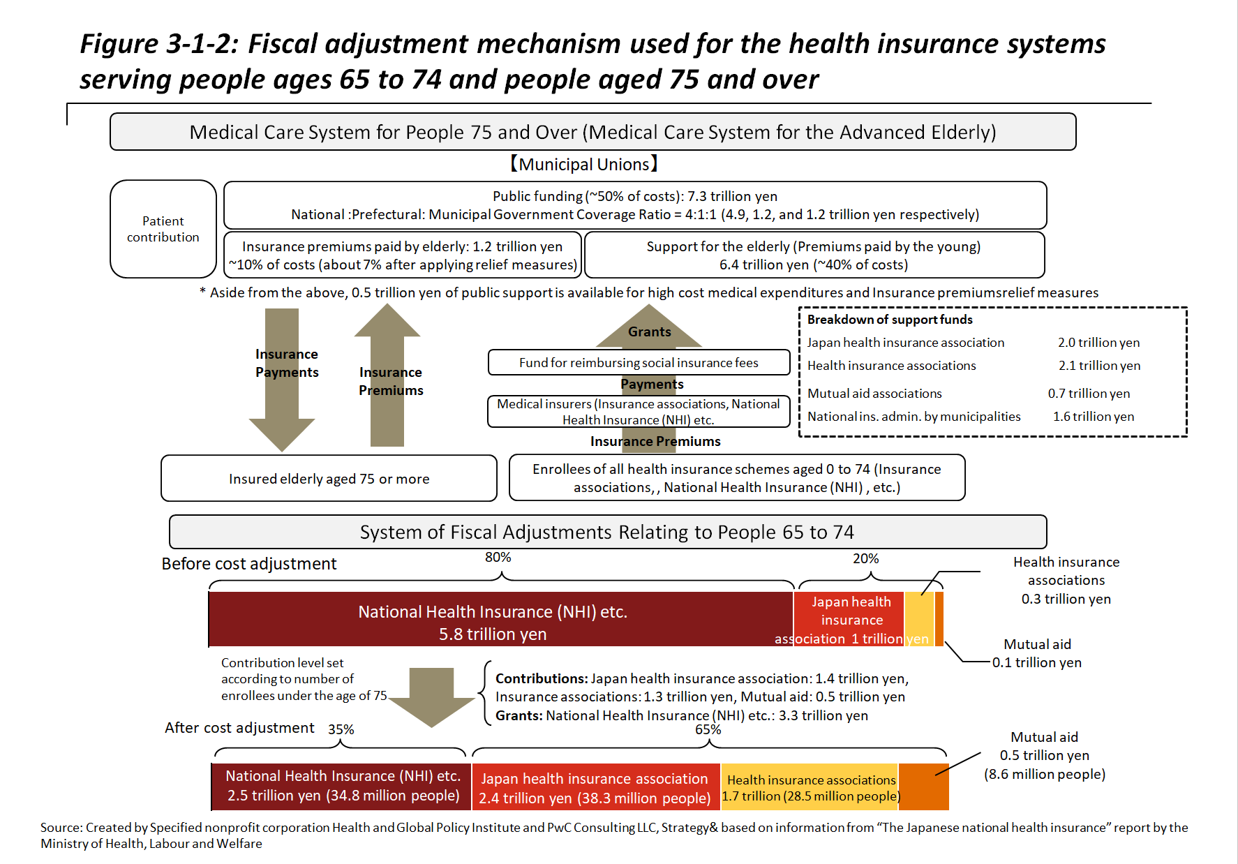The Medical Care System for the Advanced Elderly, as mentioned in Section 1, was introduced in 2008. All people aged 75 and over are obliged to enroll, and all enrollees become insured individuals, with no distinction between supporters and dependents. The system is administered at municipal as well as prefectural levels. To promote transparency and accountability regarding the expenses and medical costs that accompany the aging of the population, the system for people 75 and over has been made virtually independent from the NHI system. Premiums are calculated at the prefectural level based on health expenditures from the previous two years and are deducted from the individual pensions of enrollees. Since premium payments from enrollees themselves only cover around 10% of medical costs, the Medical Care System for the Advanced Elderly is supported by public subsidies along with fiscal adjustments from the two aforementioned insurance schemes.[10]