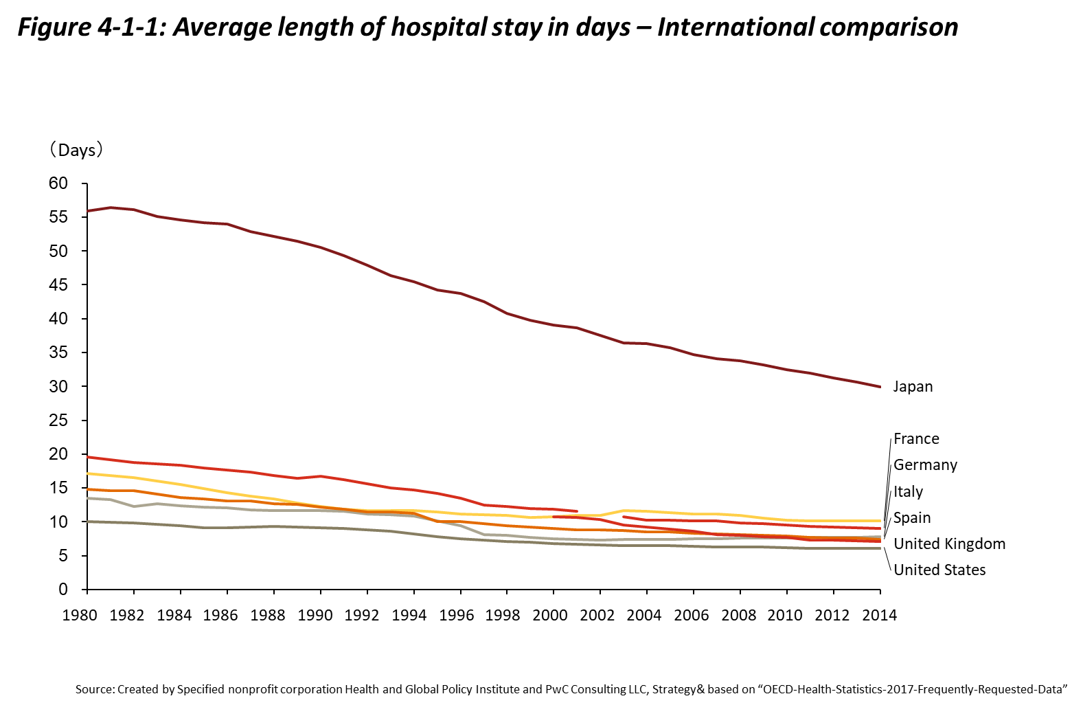 Under universal health coverage (UHC), and because Japan’s healthcare delivery system ensures unrestricted access, patients are able to receive care at any medical facility throughout the country. Another characteristic of Japan’s healthcare delivery system is that it is primarily managed by private organizations, with private hospitals (medical corporations) accounting for 70% of all hospitals and owning 50% of all hospital beds. When viewed from an international perspective, the number of hospital beds per capita in Japan is comparatively high, the average length of hospitalization is long, and the number of healthcare professionals per bed is low. For example, as shown in Figure 4-1-1, although the average length of hospitalization is falling, it remains long in comparison to other countries. On the other hand, it is important to recognize that simple comparisons are not possible, since the types of hospital beds used for calculations vary by country.[1]