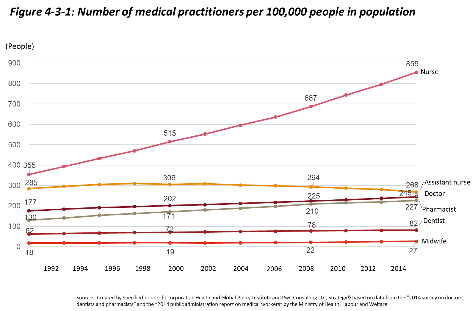 As shown in Figure 4-3-1, nurses are the fastest-growing category among medical professionals in Japan, while the number of doctors has remained relatively constant, only increasing by about 4,000 people per year.