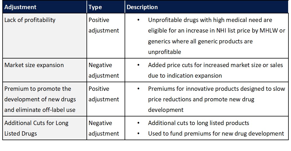 In addition to the standard biennial reassessment of drug prices in Japan, additional adjustments have also been implement to ensure products are profitable and to promote the development of new drugs while limiting overall costs by reducing prices for drugs that have seen significant market expansion or that have lost patent protection.