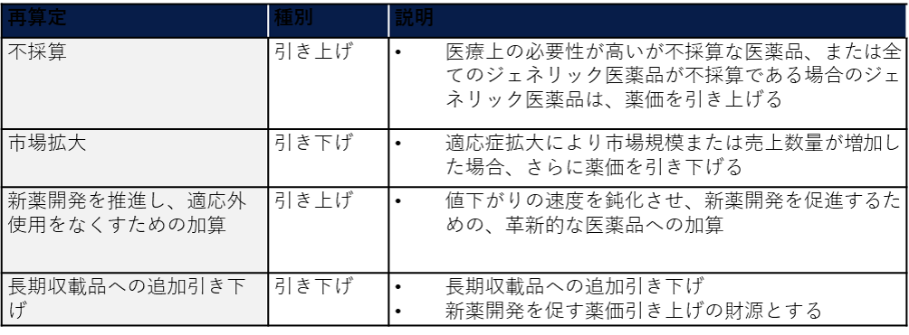 日本においては、このような標準的な薬価改定に加えて、市場が大幅に拡大したり特許切れとなったりした医薬品の価格を下げて医療費全体の増加を抑制する一方、医薬品の利益率を確保して新薬の開発を奨励するために、追加の再算定を行う制度も定めている。
