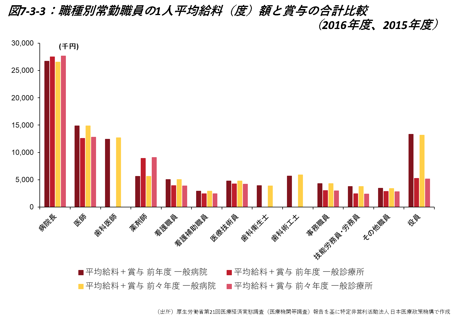 さらに、医療機関で働く常勤職員の平均給料額と賞与の合計を比較すると、図7-3-3からも分かるように一般病院、一般診療所とも、病院長、医師の平均給与額の合計が他の常勤職員と比較して高くなっている。また、常勤の薬剤師と役員以外では、一般病院と一般診療所の違いにかかわらず、平均給与額の合計は同じ職種間で大きな差はみられなかった。また一般病院、一般診療所ともに前年度、前々年度とそれぞれ比較しても大きな差はみられなかった。