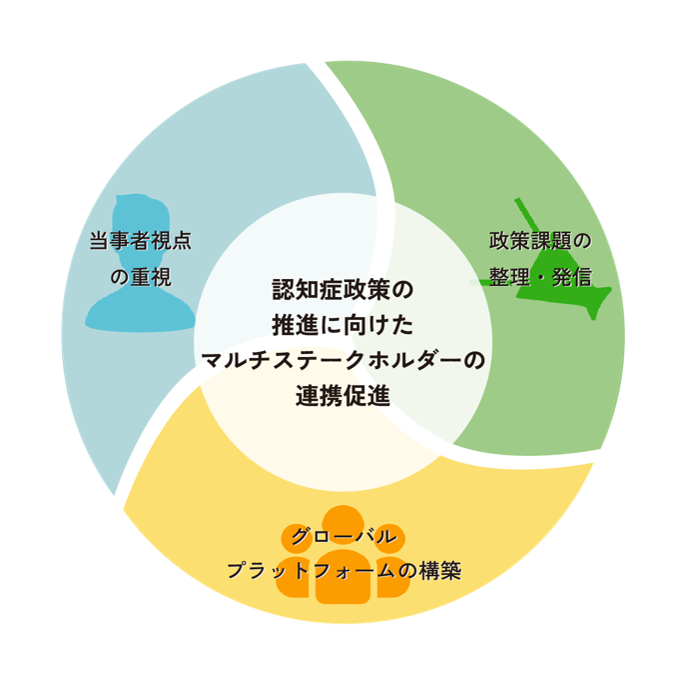 日本医療政策機構(HGPI)では、非営利・独立の医療政策シンクタンクとして、認知症をグローバルレベルの医療政策課題と捉え、世界的な政策推進に向けて取り組みを重ねてまいりました。認知症政策の推進に向けたマルチステークホルダーの連携促進を基盤とし、「グローバルプラットフォームの構築」「当事者視点の重視」「政策課題の整理・発信」を柱として、多様なステークホルダーとの関係を深めながら、活動を行っています。